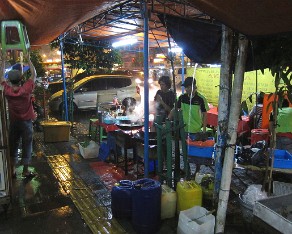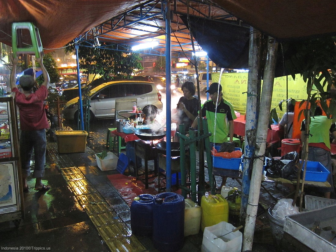 14 Its pouring rain and we choose our hawker stand to eat. Notice the guy pushing up on the tarp in order to get the water out of the roof.