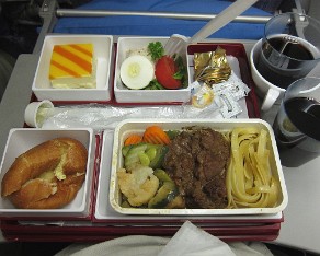 3 We have a system. On the first long leg (10 to 14 hours) dinner is served within the first two hours then, thanks to a combination of drugs and alcohol, we cosy up and go to sleep for about eight hours and arise with the smell of coffee and breakfast before landing.