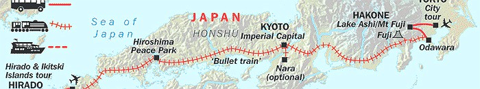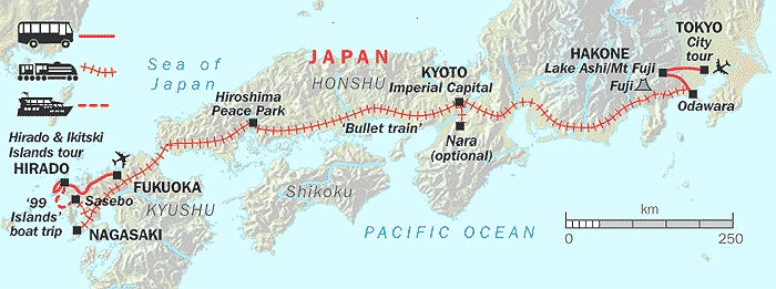 A Great trip through Japan. This trip begins with a few days in and around Tokyo (Hakone, Mt. Fuji, Odawara etc.), then off by train to Kyoto for a few days, bullet train to Hiroshima, then off by train to Nagasaki, train to port and boat trip around the "99 Islands" (actually there are 170 islands), a couple of days home stay on Hirado island and finally off to Fukuoka via Sesebo.