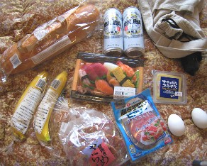 13 I bought sushi for dinner, bananas, eggs, lunch meat, bread and of course beer. If you can stop by a store every few days you can save money.