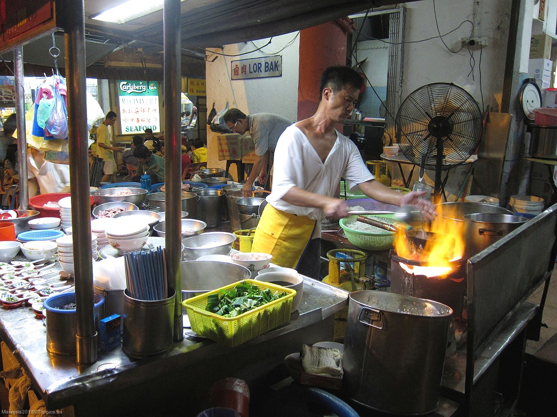 8 The flames surround the pot used for making the boiling soup very quickly, the bowls of different ingredients are all around the cook.
