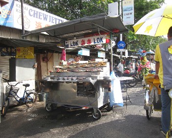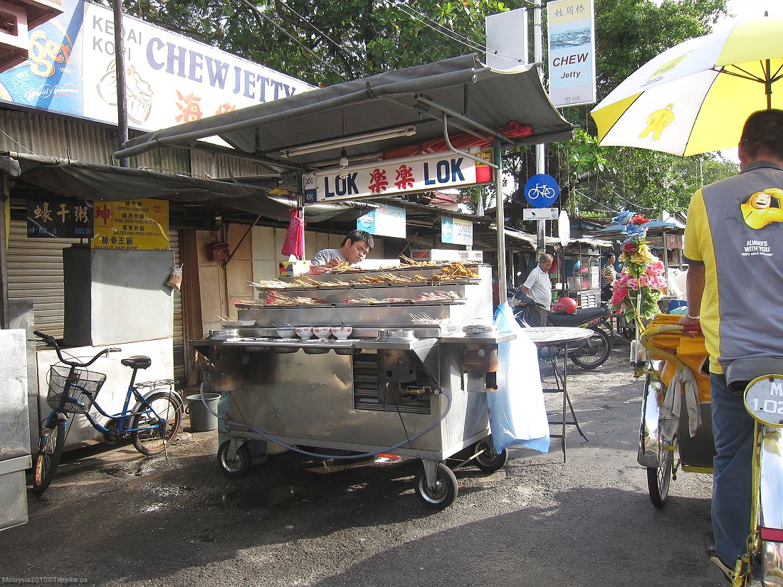19 Proceeding on from our visit around the clock tower and the port we are headed out towards the Weld Quay to see the Clan Jetties, unique Chinese settlements built on piers that extend into the Penang Channel. On our way there we pass food hawker stands along the street, looks like satay is offered here.