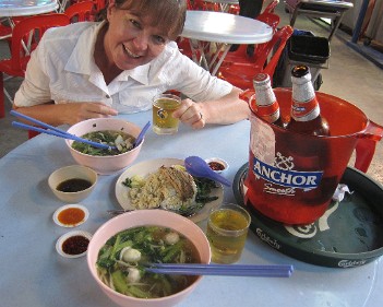 3 After checking into our hotel in Penang we head out to find dinner and find a wonderful food court where everything is offered. We decide to have hot pork ball soup, sliced pork on rice with sauce and assortment of veggies, and a bucket of beer. It all came to about ten dollars, the most we have spent in two weeks! It is a little more expensive here in Malaysia.