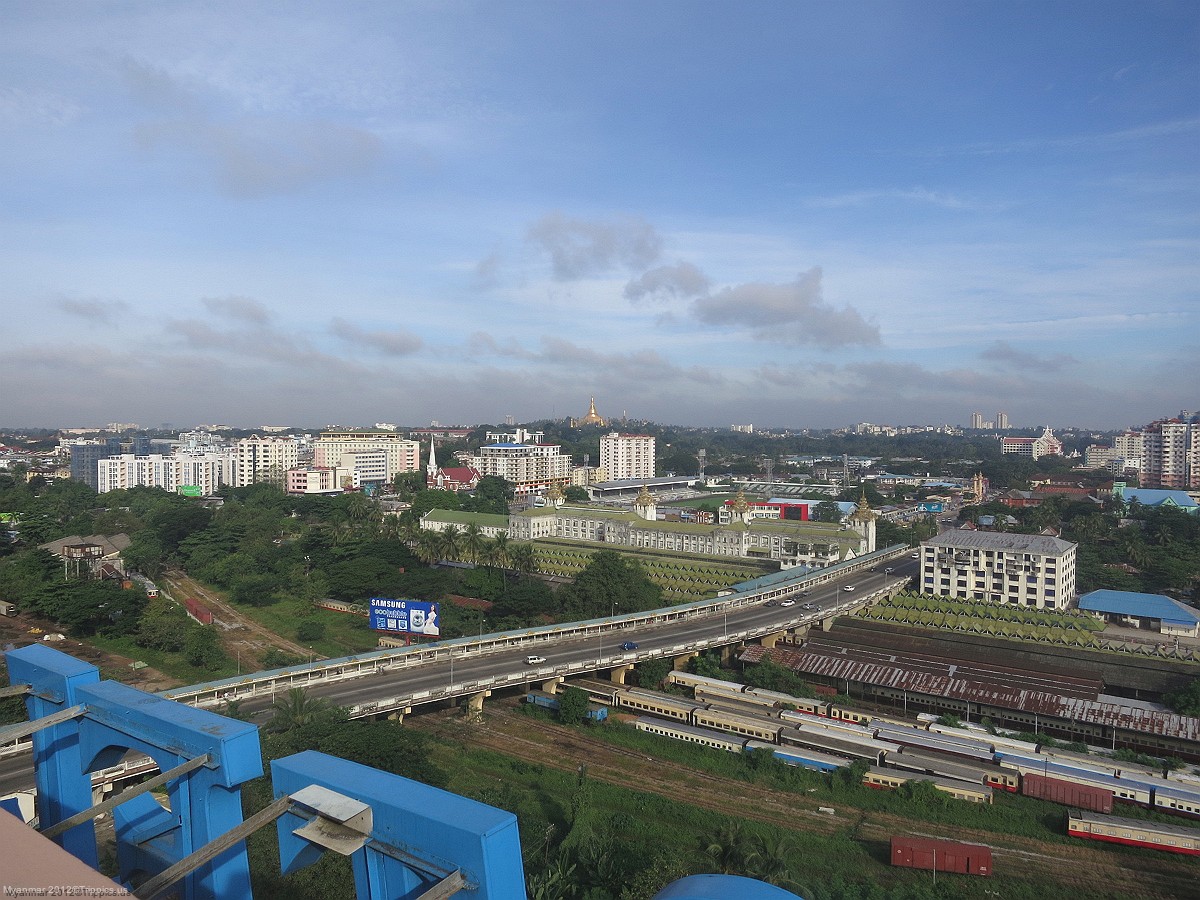 4 From another view on the rooftop we see the central Yangon train station originally built by the British in 1877. At the end of our trip when we have a couple of post trip days on our own we plan to use this train to explore Yangon and its suburbs. In the center distance we can see the Shwedagon Pagoda.