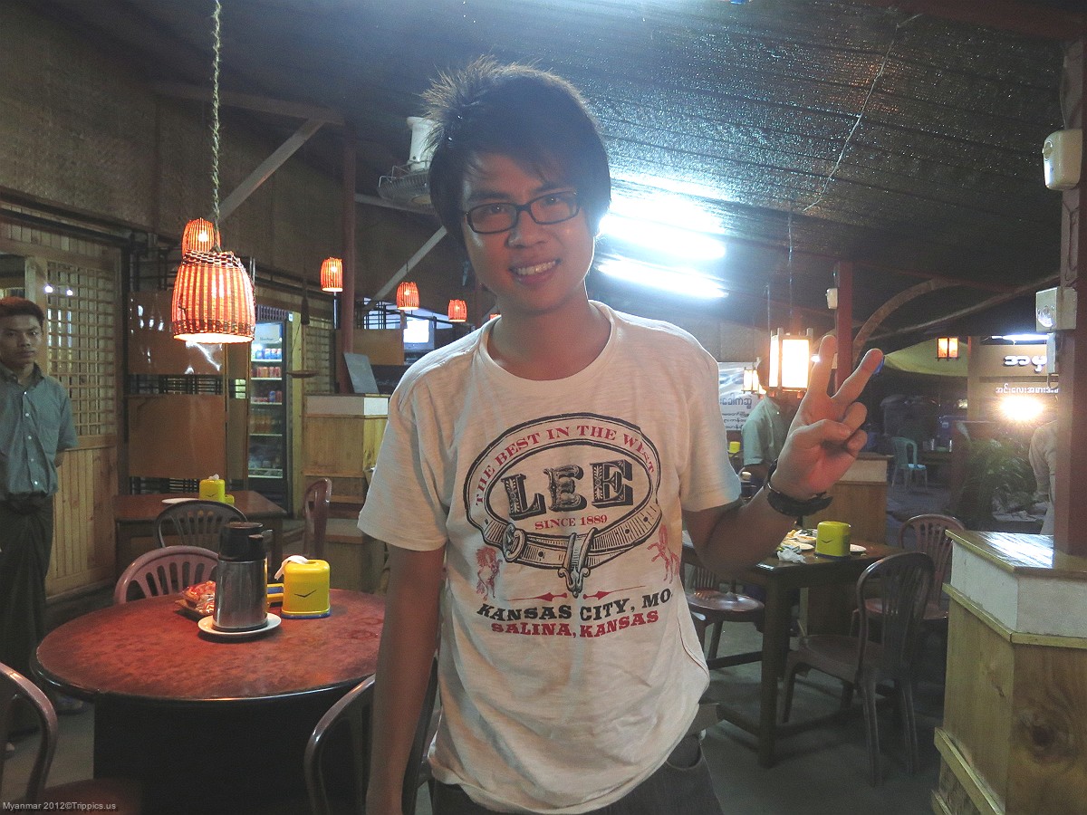 10 Its dinner time and we find a very small Burmese restaurant. Unfortunately the menu is in Burmese and no one seems to speak English. Usually in situations like this we look at what other people are eating and simply point at what we like, but it is early and we were the only ones there. After trying to converse with the owner to no avail, this young man, Chen, came up and asked if he could help. Chen pointed out a couple of items that we might be interested in which would not be too hot. It never fails that someone in a crowd will overhear your conversations and offer help. Thank you Chen.
