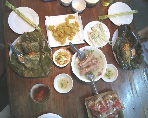 11 Wow, what a dinner. On the left are rice flour and onion tops wrapped in banana leaves. To the right is fermented pork and rice, also wrapped in leaves. In the center is our chicken soup with chicken legs (wings are optional). At the top is a fried yellow bean curd, at the bottom are pork skins. Everything was delicious, but I had to stay away from some of the garnishes as they were very spicy.