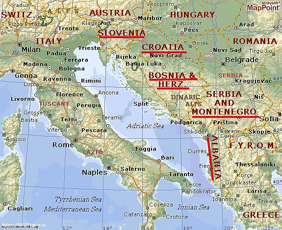 6 First stop Albania. Albania, officially the Republic of Albania is a country in South Eastern Europe. It is bordered by Greece to the south-east, Montenegro to the north, partially-recognized Kosovo to the northeast, and the Republic of Macedonia to the east. It has a coast on the Adriatic Sea to the west, and on the Ionian Sea to the southwest. It is less than 72 km (45 miles) from Italy, across the Strait of Otranto which links the Adriatic Sea to the Ionian Sea.