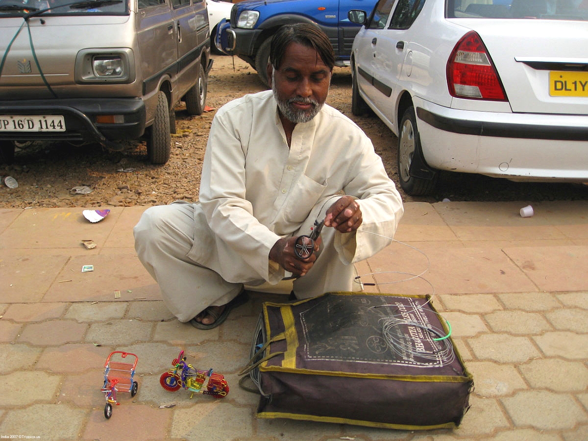 18 This man is making small bicycles and pedicycles from twisted wire. He uses needle nosed pliers and others instruments in a pain staking process to produce these works. I purchased the pedicycle you see in the picture and a bicycle he made.