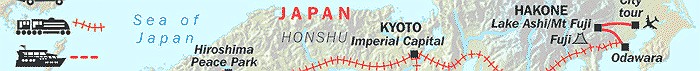 A Great trip through Japan. This trip begins with a few days in and around Tokyo (Hakone, Mt. Fuji, Odawara etc.), then off by train to Kyoto for a few days, bullet train to Hiroshima, then off by train to Nagasaki, train to port and boat trip around the "99 Islands" (actually there are 170 islands), a couple of days home stay on Hirado island and finally off to Fukuoka via Sesebo.