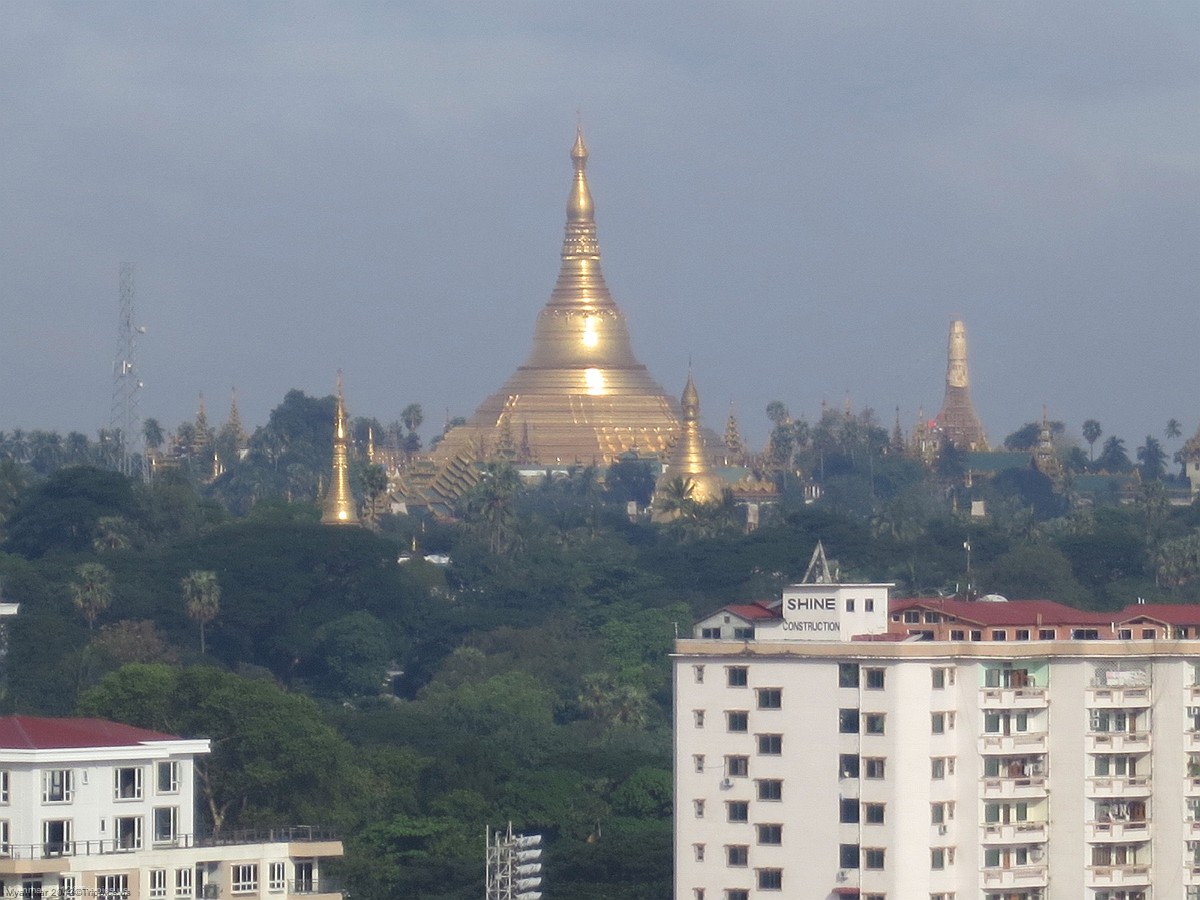 4 From another view on the rooftop we see the central Yangon train station originally built by the British in 1877. At the end of our trip when we have a couple of post trip days on our own we plan to use this train to explore Yangon and its suburbs. In the center distance we can see the Shwedagon Pagoda.