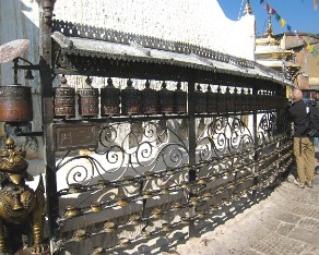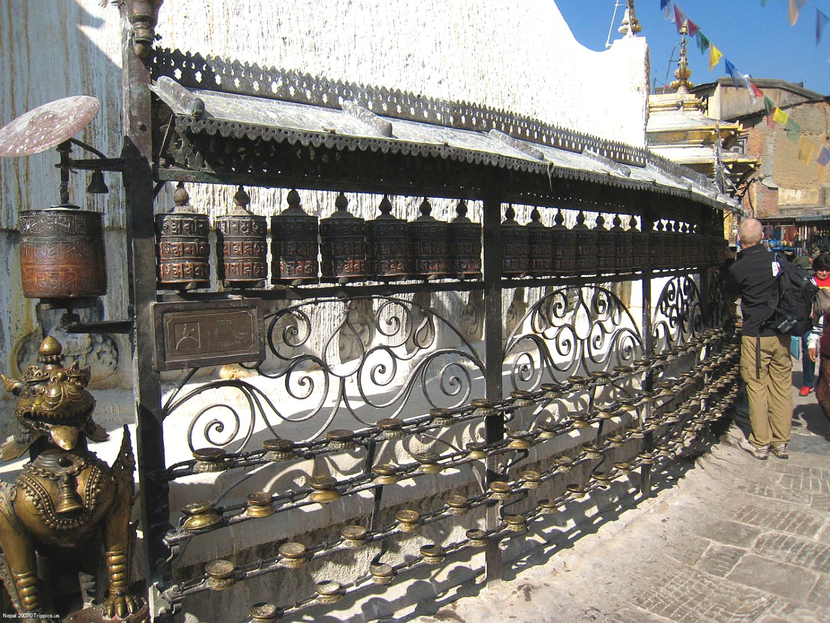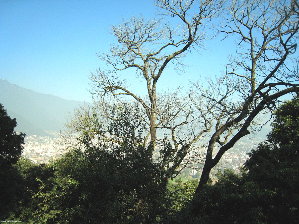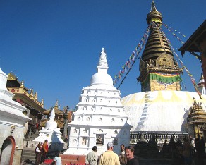 6 There are great views of the city below as we climb to the top of this pilgrimage site. According to Swayambhu Purana, the entire valley was once filled with an enormous lake, out of which grew a lotus. The valley came to be known as Swayambhu, meaning "Self-Created." The name comes from and eternal self-existent flame (svyambhu) over which a supa was later built.