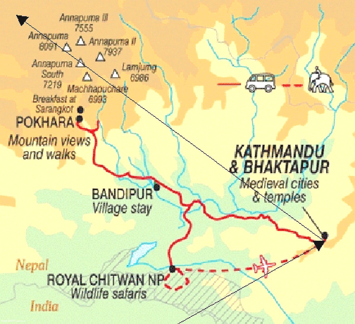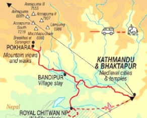 2 This is a wonderful tour of the varied areas of the mountainous Kingdom of Nepal. From the city life of Kathmandu to the quiet seldom visited village of Bandipur (my Shangri-La) to the beautiful mountain town of Pokhara at the foothills of the Himalayas to an elephant safari in the jungles of Chitwan. And much more - this country has something for everyone.